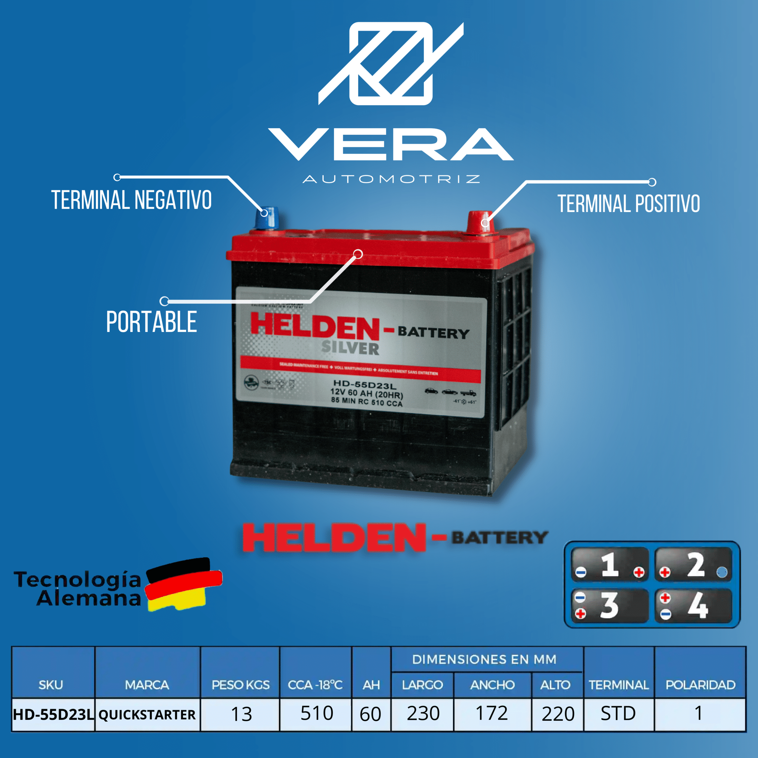 BATERIA (HD-55D23L) – 60AH – 12V 510CCA – POS DER